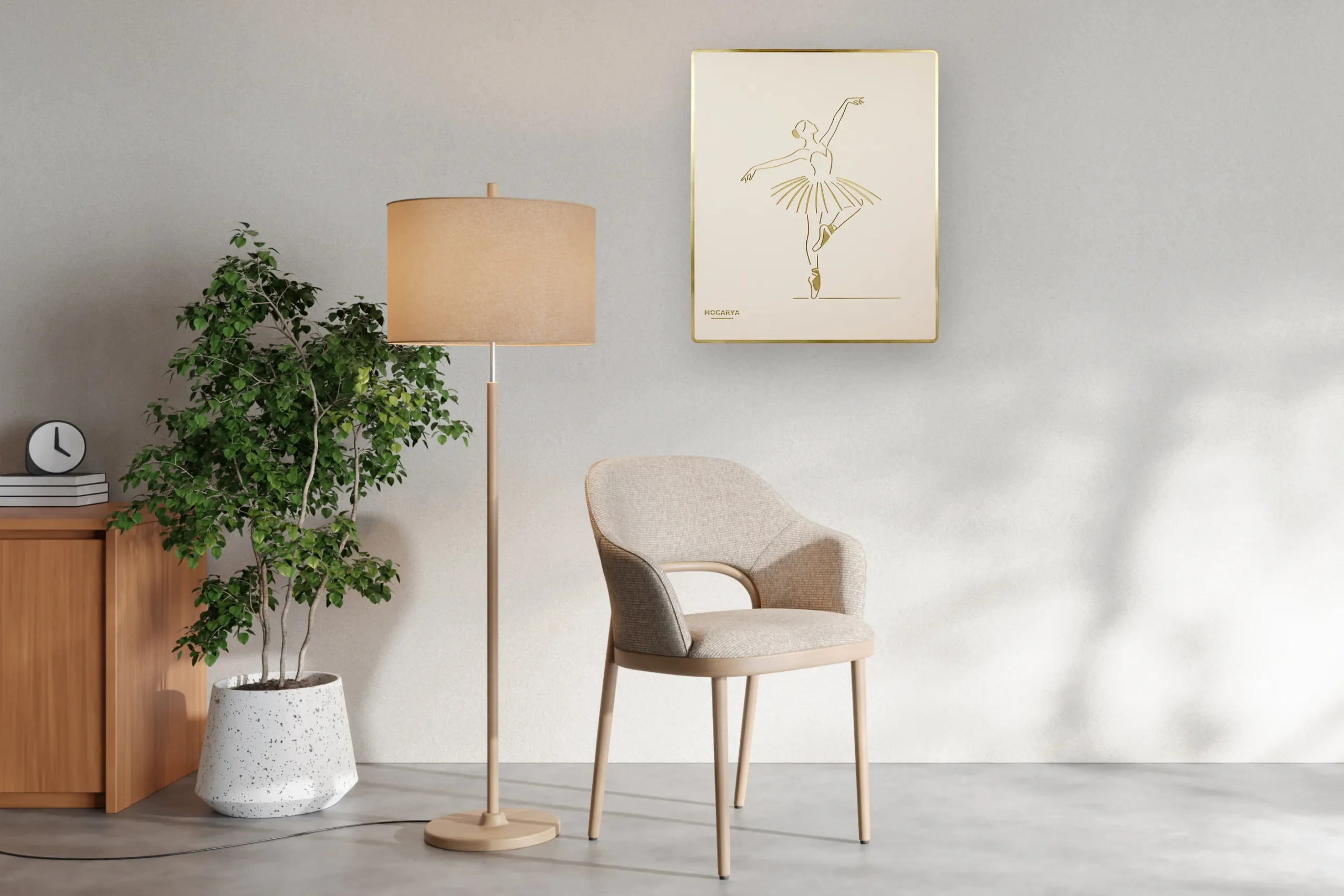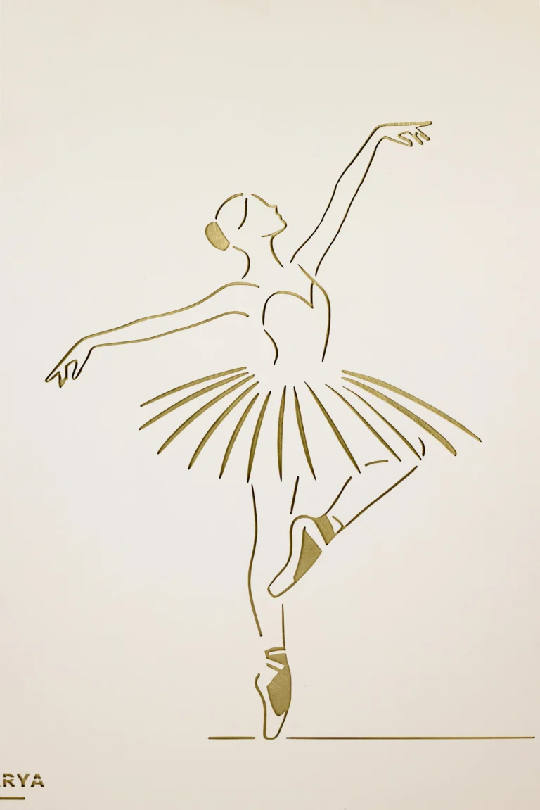 Lo stile artistico di questo quadro può essere definito minimalista e contemporaneo. La figura della ballerina è rappresentata attraverso linee essenziali e pulite, senza dettagli superflui, puntando sull’eleganza della forma e sul contrasto tra le superfici bianche e i dettagli dorati. L’uso di materiali moderni come l’acciaio inox verniciato e la galvanizzazione oro rafforza l’aspetto attuale e raffinato dell’opera, rendendola adatta a spazi dal design moderno e sofisticato